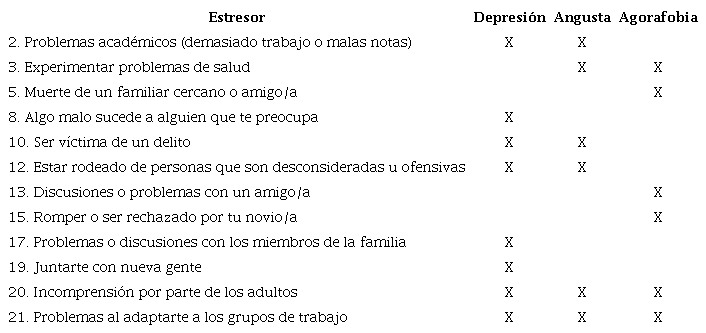 Con lo anterior, los ítems 20 y 21 se incluyen tanto en la depresión, la angusta y la agorafobia, el ítem 3 se incluye en los síntomas de ansiedad (angusta y agorafobia), y los ítems 2, 10 y 12 se incluyen en los síntomas de depresión y ansiedad. En este sentido, son discriminativos exclusivamente de depresión los estresores 8, 19 y 17; y para agorafobia los estresores 5, 15 y 13. Los estresores para la angusta se comparteron bien para la depresión o para la angusta (Tabla 8).