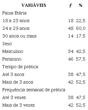 Participaram da pesquisa 80 adultos praticantes de musculação, na faixa etária de 18 a 36 anos e média de idade de 25,8±3,5 anos. Conforme os resultados da Tabela 1, observou-se que a maioria dos praticantes era do sexo feminino (57,5%), tinha entre 24 e 29 anos (60,0%), praticava musculação há mais de três anos (52,5%), com frequência semanal de mais de três vezes (52,5%).
