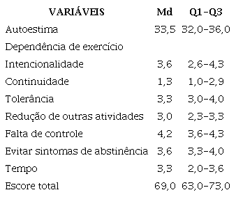De acordo com os dados da Tabela 2, nota-se que a dimensão de dependência de exercício que apresentou maior escore foi a falta de controle (Md = 4,2), seguida de evitar sintomas de abstinência (Md = 3,6), intencionalidade (Md = 3,6), tempo (Md = 3,3), tolerância (Md = 3,3), redução de outras atividades (Md = 3,0) e continuidade (Md = 1,3). Além disso, nota-se que os praticantes de musculação se percebem com alto escore de autoestima (Md = 33,5).