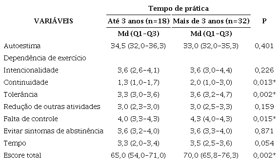 Ao comparar a autoestima e a dependência de exercício dos praticantes de musculação em função do tempo de prática (Tabela 3), verificou-se diferença significativa entre os grupos nas dimensões de dependência de exercício de continuidade (p = 0,013), tolerância (p = 0,002), falta de controle (p = 0,015) e no escore total de dependência de exercício (p = 0,002). Destaca-se que os praticantes de musculação há mais de três anos apresentaram escore superior em todas as dimensões e no escore total.