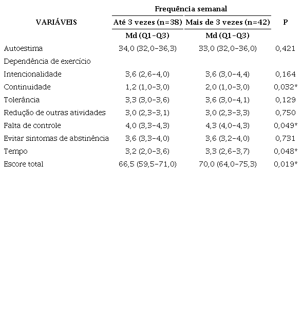 Houve diferença significativa no escore das dimensões de dependência de exercício de continuidade (p = 0,032), falta de controle (p = 0,049), tempo (p = 0,048) e no escore total (p = 0,019) entre os praticantes com frequência semanal de até três vezes e mais de três vezes (Tabela 4), indicando que os indivíduos que praticam a musculação mais de três vezes por semana apresentaram maior escore nas referidas dimensões e no escore total de dependência de exercício.