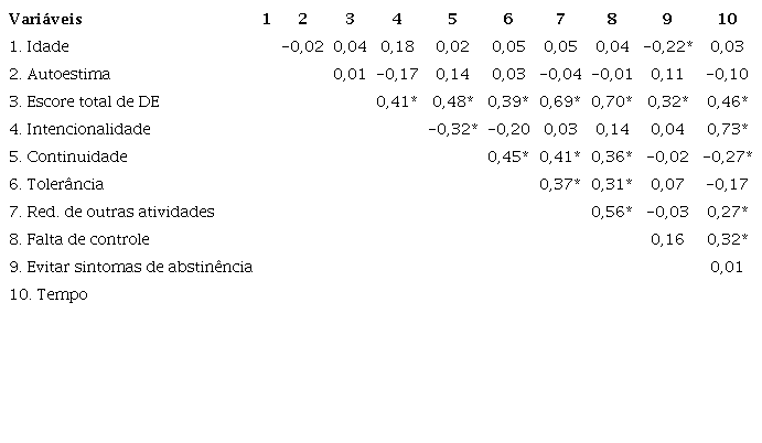Ao analisar a correlação entre a idade, a autoestima e a dependência de exercício dos praticantes de musculação (Tabela 5), foi encontrada correlação significativa (p < 0,05) e negativa somente da idade com a dimensão de evitar sintomas de abstinência (r = -0,22). Não foram encontradas correlações significativas entre a autoestima e a dependência de exercício.