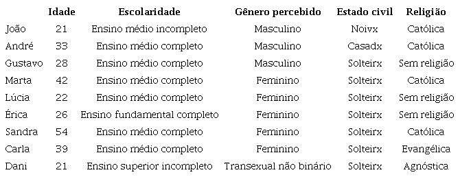 Foram entrevistadxs nove pessoas transexuais, e suas características sociodemográficas são apresentadas conforme a Tabela 1.