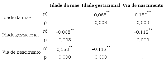 Para análise correlacional, foram consideradas, no grupo de prematuros, as variáveis idade materna, idade gestacional e via de nascimento. Conforme se observa na Tabela 2, embora as correlações sejam fracas, indicam uma direção relacionada à idade. A idade gestacional esteve negativamente correlacionada à idade materna (rô = -0,068; p = 0,008), indicando que mães com mais idade tiveram bebês com menores idades gestacionais. Em relação à via de nascimento, a correlação foi positiva, indicando que quanto maior a idade materna, maior a ocorrência de cesariana (rô = 0,150; p < 0,001). A correlação entre idade gestacional e via de nascimento foi negativa (rô = -0,112; p < 0,001), indicando que quanto menor a idade gestacional, maior a ocorrência de cesariana.