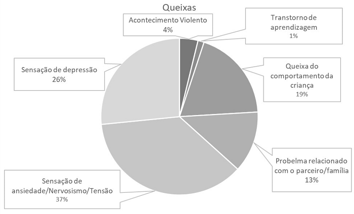 Ademais, podemos refletir sobre a diversidade de formas de descrever a queixa em saúde mental. Tal fenômeno representa a complexidade de entender e nomear o sofrimento psíquico, ainda que os manuais internacionais sejam balizas para a busca de uma linguagem comum. A pesquisa revela demandas de sofrimento e a procura de espaços para elaboração. Em um dos prontuários, temos que o paciente procura um “descarrego em palavras” (P244).