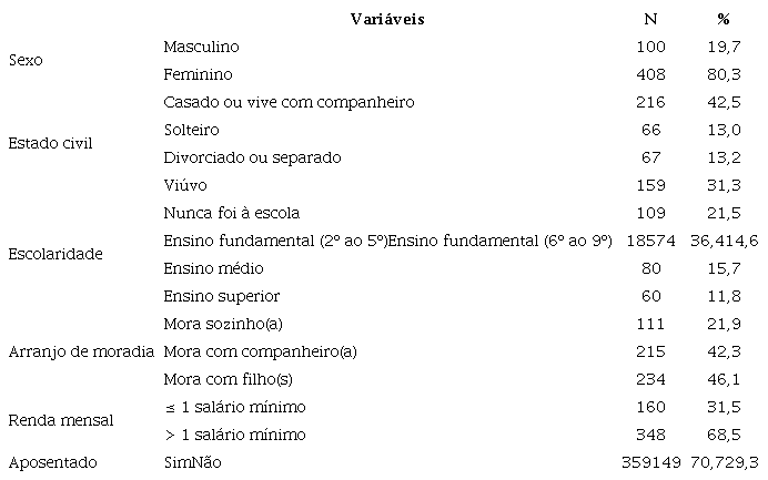 Participaram 508 idosos com idades a partir de 60 anos, adscritos nos serviços oferecidos pela Rede Básica de Atenção à Saúde dos seis distritos sanitários urbanos da cidade de Campina Grande, Paraíba, Brasil. Houve predomínio de indivíduos do sexo feminino (80,3%). A média de idade encontrada nos participantes foi de 71,16 anos (DP= 7,05), com idade mínima de 60 anos e máxima de 92 (Tabela 1).