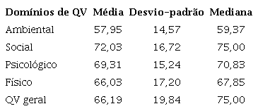 A média geral de Qualidade de Vida da amostra foi de 66,03 (DP=19,8). Os maiores escores foram identificados nos domínios social (M=72,03; DP=16,72), e o menor escore médio, 57,95 (DP=14,57), no domínio ambiental (Tabela 2).