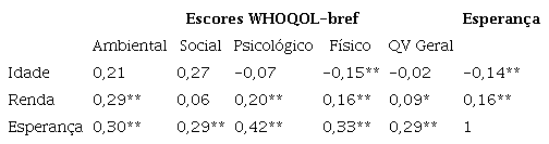 Foram encontradas correlações entre todos os domínios de QV e a variável esperança. A variável idade apresentou correlações negativas com o índice de esperança (r=-0,14). (Tabela 4).