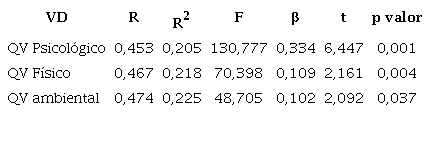 O modelo formado pelas variáveis fator psicológico, fator ambiental e fator físico da qualidade de vida explicou 22,5% da variação da esperança. Verificou-se que o fator psicológico (β=0,334; p<0,001) apresenta contribuição explicativa acentuada, considerando as demais variáveis do modelo (Tabela 5).