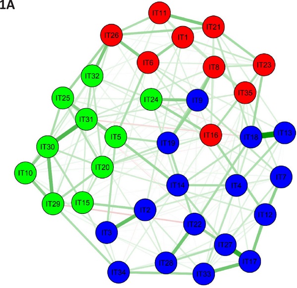 The clustering of items was also verified using Network Analysis (NA) based on the correlation between the items. Graphs were generated using LASSO’s regularization technique (Least Absolute Shrinkage and Selection Operator), estimating a network between the items based on their partial correlations. In the graphic representation models, the items (nodes) are linked through green edges (positive correlations) or red edges (negative correlations). The edges’ density indicates strong correlations: thick edges indicate strong correlations, and thin edges indicate weak correlations. We conducted the NA based on previous studies (Andrade et al., 2021; Andrade et al., 2020a, Andrade et al., 2020b, Andrade et al., 2020c; Oliveira-Pinheiro et al., 2020).