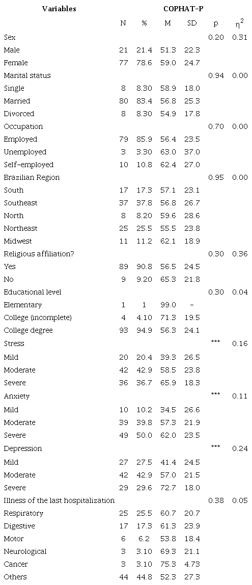 Studies addressing coping strategies report relevant information for psychological assessment and intervention. In methodological terms, this study advances toward what Skinner and Zimmer- Gembeck (2016) proposed to conduct studies addressing coping from a developmental perspective. In this sense, the online version of the COPHAT-P can support understanding regarding the coping process and the development of interventions to decrease maladaptive coping strategies and improve parents’ quality of life facing a child’s hospitalization.