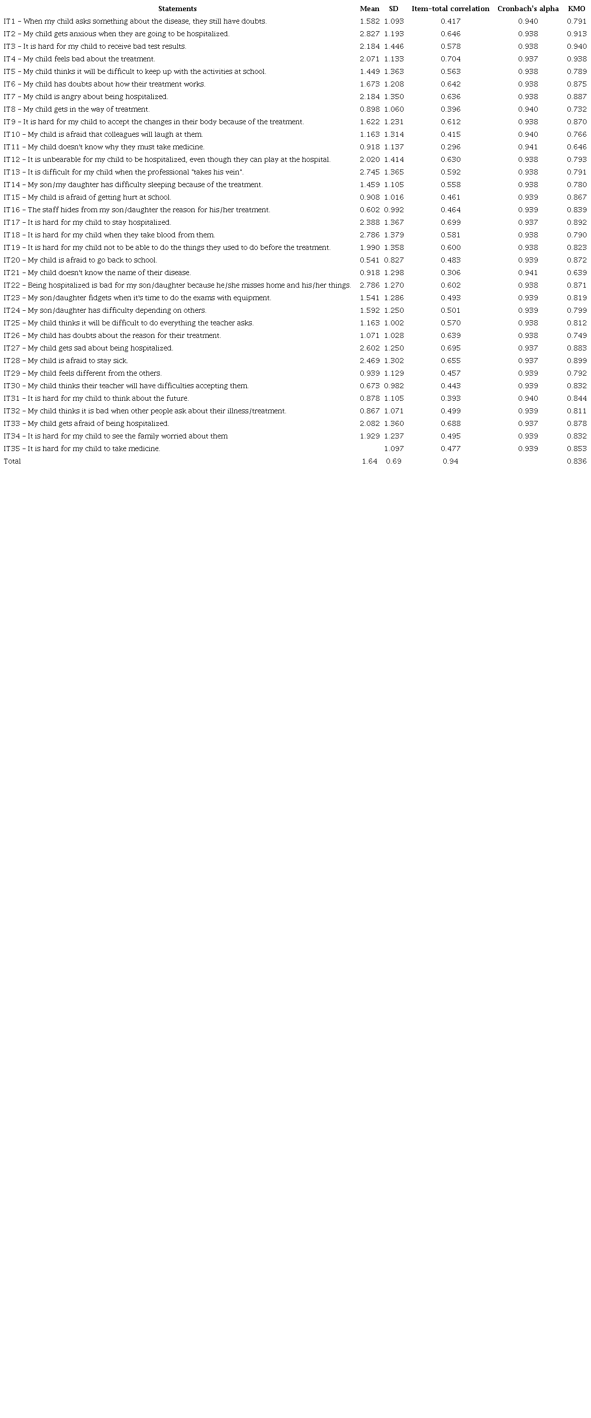 In this study, the scale’s items were grouped into three factors: Factor 1, “Hospitalization,” was comprised of 16 items addressing the period of hospitalization and coping strategies, for instance, item 2: “My child gets anxious when s/he is about to be hospitalized.” Factor 2, “Expectations for returning to school,” comprised ten items addressing expectations about the child going back to school, for instance, item 20: “My child is afraid of going back to school.” Factor 3, “Understanding the disease and treatment,” comprised nine items addressing the individuals’ level of understanding concerning the disease and treatment, for instance, item 6: “My child has doubts about how the treatment works.”