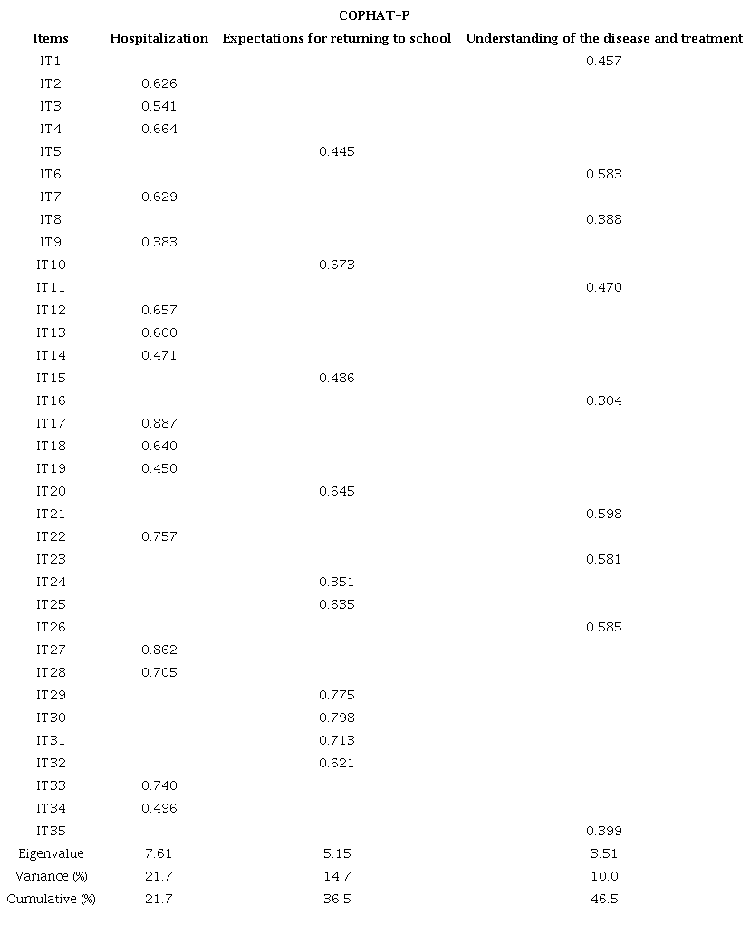 We detected that the CFA indicated unsatisfactory goodness of fit: CFI=0.662; TLI=0.634; RMSEA=0.111 (95%CI=0.103 -0.119). The EFA indicated a three-factor solution (Table 3). All items presented factor loading above 0.3 and were considered in the COPHAT-P final version. Factor 1 (Hospitalization) was composed of 16 items and explained 21.7% of the variance. Factor 2 (Expectations for returning to school) was composed of 10 items and explained 14.7% of the variance. Factor 3 (Understanding the disease and treatment) was composed of 9 items and explained 10% of the variance. Thus, the final model explained 46.4% of the variance.