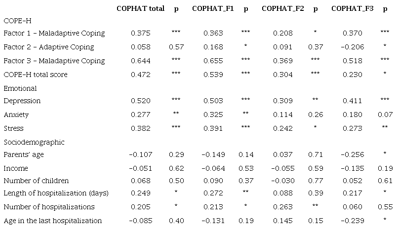 Convergent validity was examined using Spearman’s correlation between the online version of the COPHAT-P factors and total score with the COPE-H three factors and total score. Sociodemographic and emotional variables were also included in the correlation matrix.