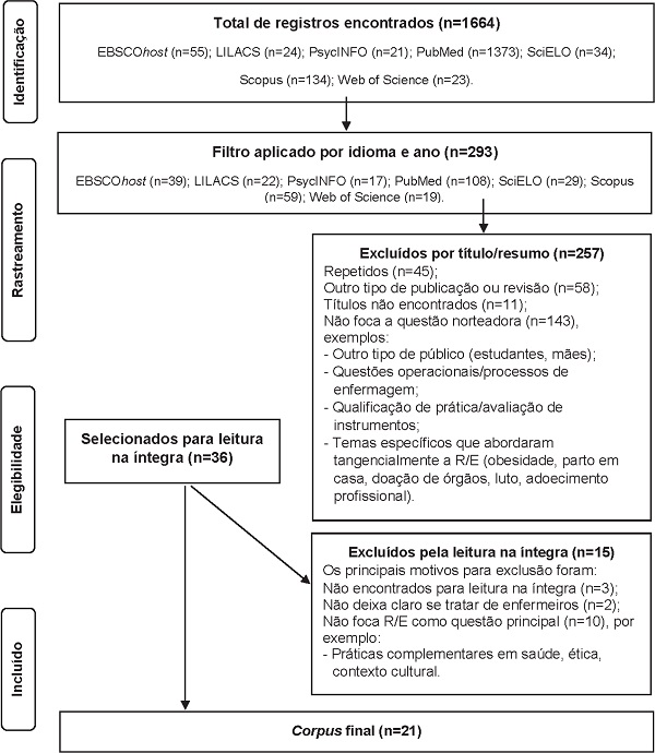 O corpus da pesquisa foi composto por 21 artigos. Os processos de busca, seleção e recuperação dessas evidências são apresentados no fluxograma (Figura 1). Os principais motivos de exclusão dos estudos no processo analítico foram: presença de artigos repetidos, outro tipo de publicação, como revisões de literatura, artigos não disponíveis na íntegra ou que não responderam à questão norteadora. Entre os estudos que não contribuíram para responder à questão, foram excluídos artigos com investigação de outro tipo de público (estudantes, mães, pacientes), que abordaram especificamente práticas operacionais e processos de Enfermagem e gestão, qualificação de práticas ou avaliação de instrumentos e temas específicos que não focavam a R/E (obesidade, parto em casa, doação de órgãos, luto, adoecimento profissional, questões éticas).