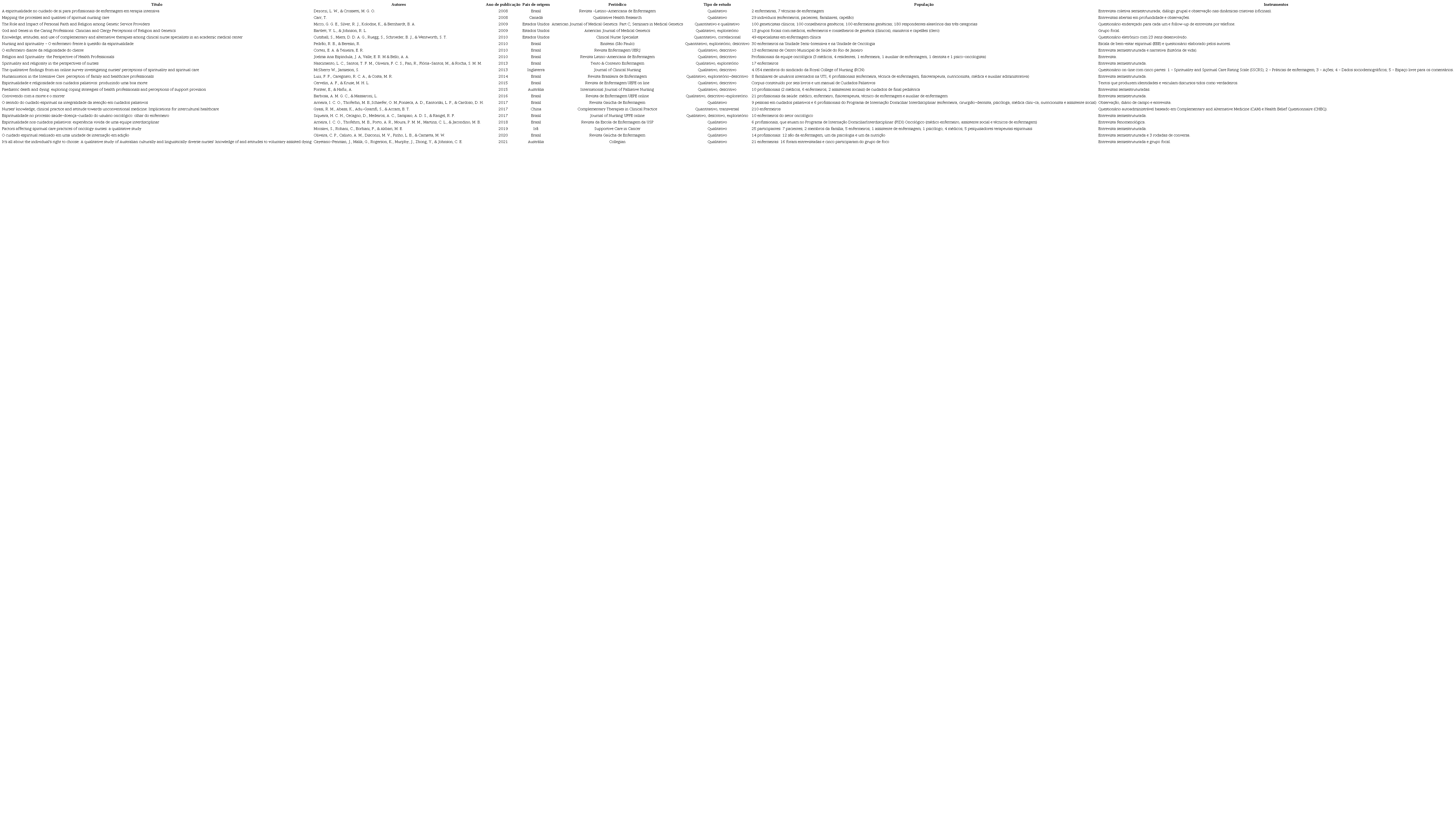 Results and Discussions: The corpus was composed of 21 studies, mostly qualitative studies (85,72%), with the first author from Brazil (57,15%). The R/S is present in nursing practice, so that some attitudes, dispositions, and behaviors seem indispensable for religious/spiritual care, and some contexts seem more conducive to such integration.