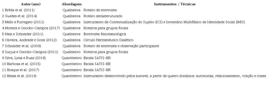Sobre os participantes, é interessante notar que, das quatro pesquisas que foram conduzidas com múltiplos grupos de interesse, três se utilizaram de instrumentos quantitativos (Silva et al., 2018; Mello & Furegato, 2008; Bosque et al., 2017). Apenas Schneider et al. (2009) optaram por usar da técnica de entrevistas e observação, apesar de terem entrevistado outros grupos além dos usuários. Dentre as pesquisas que foram conduzidas unicamente tendo os usuários dos serviços como sujeitos, houve maior variedade de instrumentos utilizados, tais como: entrevistas (Brêda et al., 2011; Nasi & Schneider, 2011; Guedes et al., 2014); grupos focais (Moreira & Onocko-Campos, 2017; Surjus & Onocko-Campos, 2011); círculo hermenêutico dialético (Oliveira et al., 2012); instrumento desenvolvido pelos autores da pesquisa (Bessa et al., 2019); escala SATIS-BR (Barbosa et al., 2015).