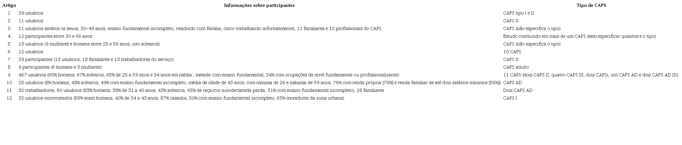 A dimensão de análise referente aos participantes do estudo possibilita ampliar a discussão em torno da pergunta orientadora que deu origem a este artigo. Encontramos pesquisas realizadas nos diversos tipos de dispositivos da rede de saúde mental, contemplando usuários que frequentavam CAPS instalados em municípios de menor porte (CAPS I e II), usuários de CAPS voltados ao atendimento das pessoas com problemas decorrentes do uso prejudicial de substâncias (CAPS AD, CAPS AD II e CAPS AD III) e CAPS em que ocorre a oferta de leitos para hospitalidade noturna com prazo determinado (CAPS III e CAPS AD III). Essa diversidade é importante, já que o tipo de serviço a que o usuário está vinculado tem impacto na sua avaliação sobre ele.