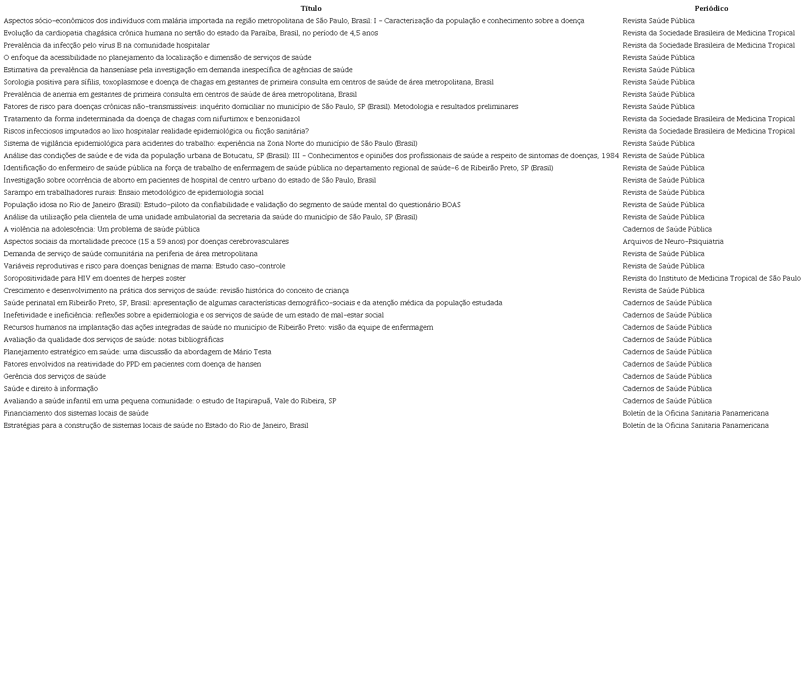 Das 34 produções estudadas, 16 (47%) foram publicadas na Revista de Saúde Pública, 10 (29%) na Revista Cadernos de Saúde Pública, 4 (12%) na Revista da Sociedade Brasileira de Medicina Tropical, 2 (6%) na Boletín de la Oficina Sanitaria Panamericana, 1 (3%) na Arquivos de Neuro-Psiquiatria e 1 (3%) na Revista do Instituto de Medicina Tropical de São Paulo. As duas revistas com maior número de publicações estão sob a responsabilidade, respectivamente, da Faculdade de Saúde Pública da Universidade de São Paulo e da Fundação Oswaldo Cruz, no Rio de Janeiro.