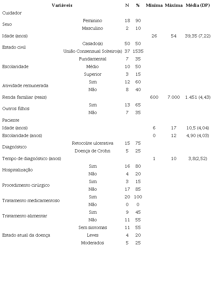 A Tabela 1 apresenta informações detalhadas sobre o perfil sociodemográfico dos cuidadores participantes e também os dados sociodemográficos e as condições clínicas de saúde dos pacientes. Os pacientes tinham diagnóstico de RCU 15 (75%) ou DC 5 (25%).Três pacientes (15%) haviam sido submetidos a procedimentos cirúrgicos e nove (45%) a restrições alimentares. Além da DII, duas crianças também apresentavam diagnóstico de intolerância à lactose, uma criança tinha anemia falciforme e uma criança tinha hepatite autoimune. Sobre a apresentação de sintomas desde o diagnóstico, os pais relataram a ocorrência de diarreia (n=20; 100%), diarreia com sangue (n=18; 90%), urgência fecal e dor abdominal (n=19; 95%), perda de peso (n=16; 80%), falta de apetite (n=12; 60%) e constipação (n=6; 30%). Ademais, cerca de 30% dos pacientes vivenciaram experiências recorrentes de hospitalização. Alguns pais também referiram a observação de sintomas extraintestinais, como problemas dermatológicos (n=4; 20%), dores articulares (n=4; 20%), febre (n=2; 10%), vômitos (n=2; 10%) e distensão abdominal (n=1; 5%). Todavia, no período da coleta de dados, todos os pacientes apresentavam condição clínica estável e apenas nove crianças experienciavam sintomas leves ou moderados no momento da coleta de dados.