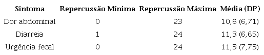 Questionário sobre as Repercussões dos Sintomas das Doenças Inflamatórias Intestinais na Qualidade de Vida de Pacientes Pediátricos. Esta medida foi desenvolvida especificamente para este estudo, com base na literatura sobre a sintomatologia da doença e no Inflammatory Bowel Disease Questionnaire (IBDQ) (Mitchell et al., 1988). O questionário possui três blocos de questões e cada um deles aborda um dos três sintomas mais comuns da doença: dor abdominal, diarreia e urgência fecal. Para cada um dos sintomas, investigaram-se as respectivas repercussões sobre três esferas da vida de crianças e adolescentes, as emoções, a vida escolar e as interações sociais da criança, com perguntas sobre a frequência com que o paciente se mostrava afetado ou prejudicado por tais sintomas da doença. Para responder às perguntas do questionário, o participante escolheu uma das três seguintes alternativas: quase nunca; às vezes; quase sempre.