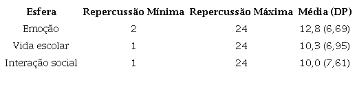 A Tabela 3 apresenta a média e o desvio-padrão dos três sintomas, analisados conjuntamente, sobre cada uma das três esferas da vida examinadas. As médias das repercussões dos sintomas nas interações sociais e na vida escolar das crianças foram bastante semelhantes, e a média da repercussão dos sintomas nas emoções da criança foi levemente superior às anteriores, igual a 12,8 (DP=6,96).