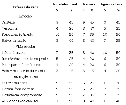 Sobre as repercussões emocionais dos sintomas, os relatos indicaram que, na presença de dor abdominal, as crianças frequentemente apresentavam preocupação/medo, tristeza e raiva/irritação. Na presença de diarreia, foram mais frequentes as emoções de tristeza, vergonha e raiva/irritação. E, em sintomas de urgência fecal, os relatos indicaram maior frequência de preocupação/medo e tristeza. Na esfera da vida escolar, o prejuízo mais frequentemente relatado, em todos os três sintomas avaliados, foi a criança não ir à escola. No âmbito das interações sociais, a rotina de se envolver em atividades recreativas com pares foi destacada como a mais frequentemente prejudicada em cada um dos três sintomas investigados.