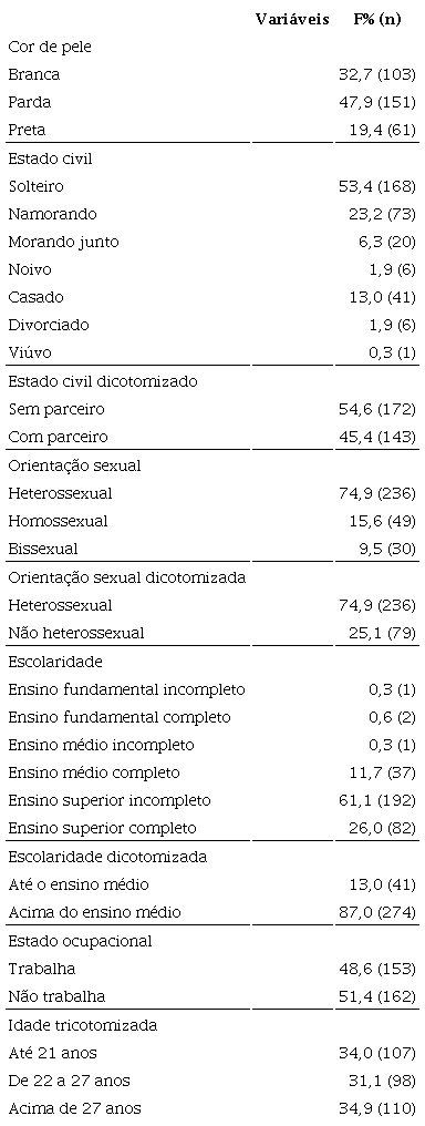 Na Tabela 1, constam todos os dados referentes ao perfil sociodemográfico da amostra. Destaca-se a amostra como tendo majoritariamente em sua composição pessoas com cor de pele parda (47,9%; n = 151), solteiras (53,3%; n = 168), heterossexuais (74,9%; n = 236), desempregadas (51,4%; n = 162) e pessoas com ensino superior incompleto (61,0%; n = 192). A maior proporção na distribuição da orientação sexual e da escolaridade se manteve após a dicotomização das variáveis.
