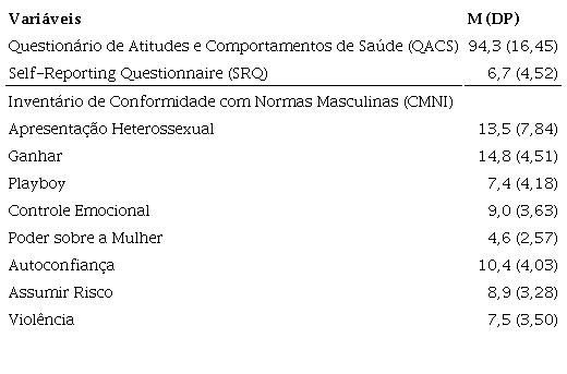 Métodos: Utilizaram-se um questionário sociodemográfico, o Inventário de Conformidade com Normas Masculinas (CMNI), o Self-Reporting Questionnaire (SRQ) e o Questionário de Atitudes e Comportamentos de Saúde (QACS). Participaram da análise 315 homens adultos de todo o Brasil.