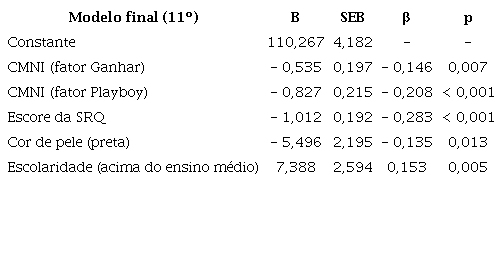 O modelo final da regressão linear foi alcançado em onze passos e foi responsável por 20,3% da variância explicada ( Tabela 3). Foram excluídos do modelo os fatores de Apresentação Heterossexual, Autoconfiança, Violência, Controle Emocional, Poder sobre a Mulher e Assumir Risco, bem como as variáveis cor de pele parda e branca, todos os estratos de idade e a variável orientação sexual dicotomizada ( p > 0,05). Permaneceram no modelo final: os fatores Ganhar ( p = 0,007) e Playboy ( p < 0,001), o escore da SRQ ( p < 0,001), a cor de pele preta ( p = 0,013) e a escolaridade acima do ensino médio ( p = 0,005).