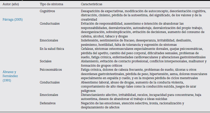 Se encuentra una diversidad de síntomas en este síndrome que van desde reacciones sociales y fisiológicas hasta cambios en estados psicológicos. En las organizaciones los primeros que notan los cambios son los compañeros de trabajo, en las relaciones interpersonales ya que el bajo desempeño afecta el clima laboral y personal. Es por eso que cuando el ambiente organizacional no favorece el necesario ajuste entre las necesidades de los empleados y los objetivos de la empresa, se ocasiona una disminución en la calidad de los servicios que no es más que la representación palpable de un perjuicio de ilusiones (Álvarez & Fernández, 1991). En la tabla 1 se citan 2 autores que clasifican a los síntomas del burnout en base a sus criterios:
