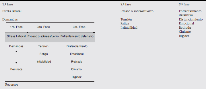 Álvarez y Fernández (1991) catalogan al burnout como un proceso continuo que se presenta en diferentes fases, como se puede observar en la tabla 2, en el cual el burnout propiamente dicho aparece con pequeños síntomas a partir del primer año llegando a la tercera fase con síntomas graves lo que vendría a ser una respuesta a una situación laboral intolerable.