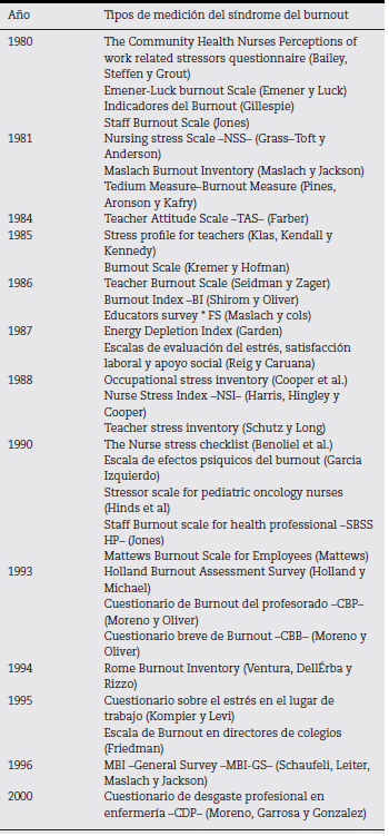 Este instrumento es el más empleado para medir el burnout en todo el mundo según investigadores y psicólogos, con una fiabilidad cercana al 90%, seguido por el Burnout Measure de Pines (Miravalle, s.f.); no obstante cabe recalcar que existen varios tipos de medición que con el paso del tiempo se han ido mejorando con el objetivo de encontrar una herramienta que permita diagnosticar este síndrome. A continuación en la tabla 4 se detallan los instrumentos que han sido utilizados para evaluar el síndrome del burnout a través de los años.
