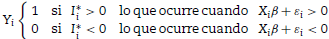 En general se considera que detrás de la variable dependiente en estos modelos Y se encuentra una variable no observable, I, que depende de un conjunto de variables explicativas, Xi, que toma ciertos valores si se ha sobrepasado cierto umbral, como se expresa a continuación.