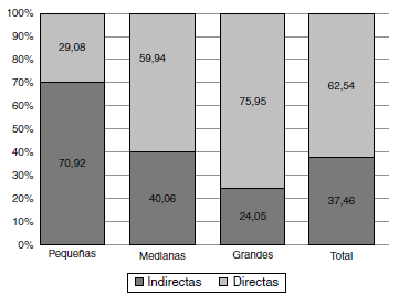 Pero en Colombia no todas las empresas tienen la posibilidad de enviar sus exportaciones directamente a sus demandantes, dados los trámites burocráticos, la trabas administrativas, las normas fitosanitarias y los ingentes costes de transporte. En ocasiones se realizan envíos al extranjero mediante terceros (exportaciones indirectas) para facilitar este proceso. En este sentido, cerca del 37,4% de las firmas exportan de manera indirecta, mientras un 62% lo hacen directamente. Por tamaño, se aprecia que cerca del 70% de las empresas pequeñas que exportan lo hacen de manera indirecta; en el caso de las empresas grandes, este porcentaje disminuye hasta el 24%, ya que estas últimas tienen todos los recursos a su alcance para la creación y el montaje de los canales de distribución y la comercialización de sus productos en el extranjero (fig. 1).