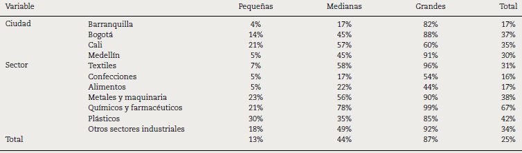 En este trabajo se representa la tendencia a exportar como proxy de la internacionalización de la empresa; trabajos como los de Horta (2012), Mendoza (2009) y Peters (2004) sugieren esta aproximación, dado el bajo nivel de inversión directa de las empresas latinoamericanas en el extranjero. En este sentido, una breve aproximación descriptiva de la encuesta de empresas del Banco Mundial refleja una propensión media regional a exportar de alrededor del 25% (tabla 1); resaltan las empresas de Bogotá y Cali, donde el 35% de las empresas industriales encuestadas reportaron haber exportado algún producto entre 2006 y 2010.