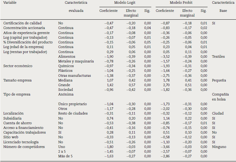 Para la interpretación de los resultados, el efecto marginal (elasticidad) en las variables continuas equivale al porcentaje en el que se incrementa la probabilidad de exportar dado un cambio del 1% en la variable independiente de análisis. Para las categóricas, el efecto marginal mide la probabilidad de manera relativa como comparación de una característica base, por ejemplo, la probabilidad de que una empresa mediana exporte es un 42% mayor que en una empresa pequeña. Con estos parámetros también se pueden estimar las probabilidades absolutas de exportar si se posee o no una característica; esta última perspectiva es la utilizada en la mayor parte de las corroboraciones de las hipótesis planteadas.