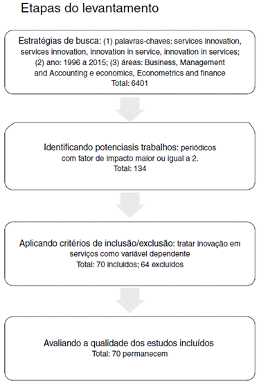 Frente aos 134 trabalhos, aplicou-se o critério de inclusão/exclusão: a inovação em serviços ser variável dependente. Nesse sentido, caso o estudo tratasse a inovação como variável dependente, este seria incluído. Caso não, excluído. Portanto, aplicado o critério, restaram 70 artigos incluídos (todos em inglês) e 64 excluídos. Além disso, um editorial foi excluído, pois buscava-se incluir somente artigos. Na figura 1, verificamse as etapas dos procedimentos.