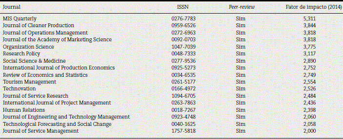 Para responder à pergunta norteadora deste estudo, aplicouse, na base de dados Scopus, em abril de 2016, as palavras-chaves: «service innovation», «services innovation», «innovation in service» e «innovation in services», devido à ampla recorrência dessas palavras na literatura usada para o referencial teórico. Delimitou-se, em 20 anos, o período do levantamento (1996-2015). Além disso, foram selecionadas as áreas de «Business, Management and Accounting» e «Economics, Econometrics and Finance». Assim, aplicadas as restriç ões, obteve-se um resultado de 6.401 trabalhos e, a partir desse resultado, foram selecionados apenas os publicados em periódicos com fator de impacto maior ou igual a 2, totalizando 134 trabalhos com potencial para inclusão. Na tabela 1, apresentamse os periódicos utilizados.