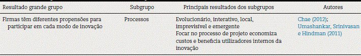Ainda em processos, mas focando projetos, Barlow, Bayer e Curry (2006) abordam que as diferenças de sucesso entre 2 projetos parecem surgir da abordagem utilizada para o planejamento e implementação durante a fase-piloto. Por outro lado, Umashankar, Srinivasan e Hindman (2011) levantam que os funcionários de serviços representam uma fonte crítica do feedback gerado pelo usuário, e a aceleração do processo de design economiza custos e beneficia os utilizadores internos da inovação. Na tabela 2 verificam-se os resultados do grupo.