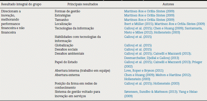 No tocante ao segundo grupo, pode-se dizer que foram encontradas 12 variáveis que são consideradas na inovação em serviços. São elas: formas de gestão, estratégias adotadas pela organização, tamanho, localização, TIs empregadas e habilidades com essas tecnologias, globalização, desafios sociais, desafios ambientais, papel do estado, abertura interna, abertura externa e a posição das empresas em redes de conhecimento. Essas variáveis interdependentes orientam a empresa em direção à inovação em serviços, melhorando os desempenhos financeiro e não financeiro. Para isso, uma nova organização, apoiada pela alta gestão, deve ser estabelecida para que a firma inove (Gallouj et al., 2015 ;Chen & Huang, 2009 ; Chang et al., 2012; Brown et al., 2012 ;Reynoso, Kandampully, Fan & Paulose, 2015;Yang & Hsiao, 2009;Cainelli & Mazzanti, 2013 ; Ibert & Müller, 2015; Love, Roper & Bryson, 2011 ; Martínez-Ros & Orfila-Sintes, 2009; Melton & Hartline, 2012 ; Orlikowski & Scott, 2015 ; Santamaría, Nieto & Miles, 2012 ; Hollenstein, 2003; Desmarchelier, Djellal & Gallouj, 2013 ; Prieger, 2002). A tabela 3 apresenta esses resultados sinteticamente.