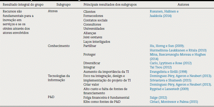 Portanto, percebe-se que a literatura abordada pelo presente estudo poderia ser categorizada em grupos que relacionavam a inovação em serviços a tópicos específicos, classificando-se em 6 grandes grupos: modos de inovação em serviços, variáveis a serem consideradas para inovar em serviços, recursos, desempenho, relação entre os atores envolvidos na inovação em serviços e estratégias organizacionais voltadas para a inovação.