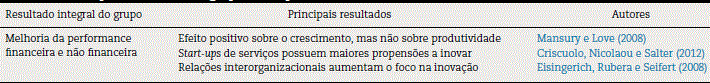 A inovação melhora os desempenhos financeiro e não financeiro. Mansury e Love (2008) descobrem que: (1) a presença de inovação de serviços e a sua extensão tem um efeito positivo sobre o crescimento, mas nenhum efeito sobre a produtividade; (2) há evidências de que o efeito do crescimento de inovação pode ser atribuído para as ligaç ões externas mantidas no processo de inovaç ão; e (3) ligaç ões externas têm um efeito extremamente positivo sobre o desempenho da empresa. Além disso, verificara-se que start-ups diferem consideravelmente de firmas já estabelecidas quanto à inovação (Criscuolo, Nicolaoub & Salter, 2012).