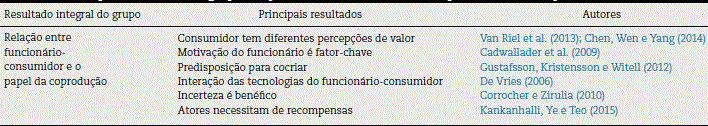 Por isso, Cadwallader, Jarvis, Bitner e Ostrom (2009) percebem que, às vezes, estratégias de marketing dão errado, pelo simples fato de esses funcionários não executarem o serviço apropriadamente por falta predisposição para inovar. Aliada a isso, há necessidade de funcionários motivados para que isso facilite o processo de interação, ajudando os clientes a participarem da produção e, também, induzam a interação entre as tecnologias de ambas as partes. Esses elementos se aliam a um ambiente de incertezas e a necessidade de recompensas (Gustafsson, Kristensson & Witell, 2012;Cadwallader et al., 2009;de Vries, 2006 ;Corrocher & Zirulia, 2010;Oliveira & Von Hippel, 2011;Kankanhalli, Ye & Teo, 2015). Na tabela 6, apresenta-se a síntese desses resultados.