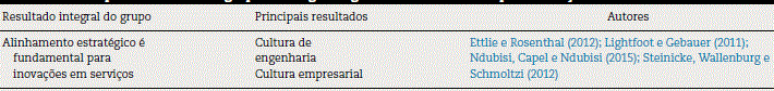 Por fim, houve artigos que enfocaram as estratégias organizacionais perante a inovação em serviços. Ettlie e Rosenthal (2012) identificam 2 estratégias (cultura de engenharia e cultura empresarial) perseguidas pelo desenvolvimento das firmas. Ambas necessitam do patrocínio do CEO, mas baseiamse em diferentes culturas. Nesse sentido, o alinhamento estratégico é fundamental para as inovaç ões de serviços; entretanto, elas são complexas e apontam para uma relação significativa entre a estratégia de inovação e desempenho (Lightfoot & Gebauer, 2011;Ndubisi, Capel & Ndubisi, 2015).
