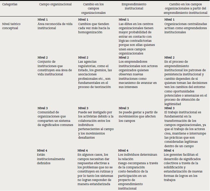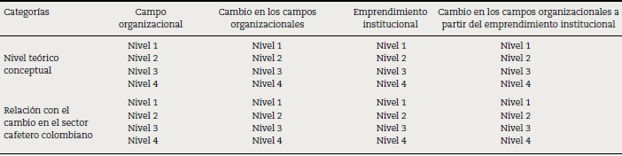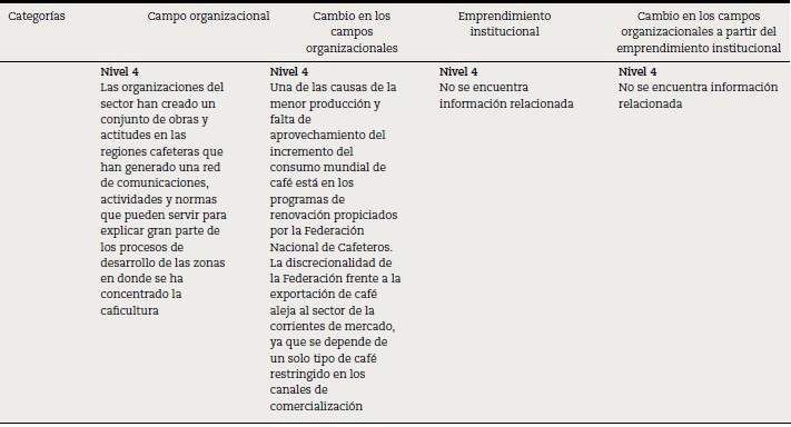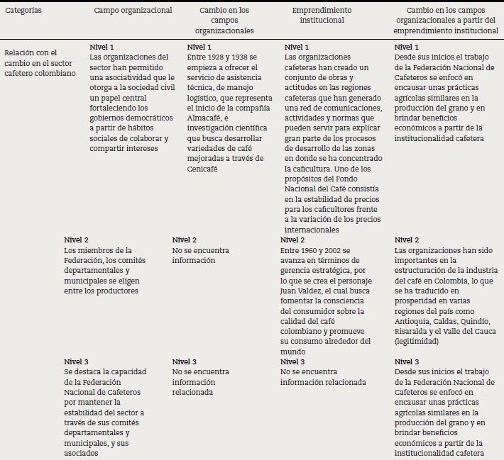 Finalmente, se encuentran aquellos documentos que poseen una fuerte relación entre los campos organizacionales (5 documentos), el cambio en esos campos (6 documentos), el emprendimiento institucional (6 documentos), el cambio a partir del emprendimiento institucional (5 documentos) y el cambio en el sector cafetero colombiano (5 documentos) (tabla 1). Todo esto se realiza en 4 niveles por cada categoría, estableciendo relaciones entre el nivel teórico-conceptual y la relación con el sector cafetero colombiano.