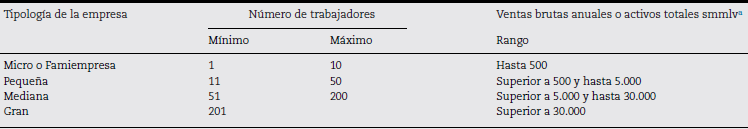 De acuerdo con la definición del artículo 43 de la Ley 1450 de 2011 que modifica el artículo 2 de la Ley 590 de 2000, los criterios de clasificación de las firmas corresponden a los indicados en la tabla 1.