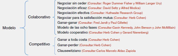 Ahora bien, podemos agrupar los diferentes modos (estilos) de negociar en dos modelos arquetípicos: colaborativo y competitivo (fig. 4). Carlos Marcelo Aldao Zapiola nos ofrece una interesante descripción de estos modelos en su obra La negociación: Un enfoque transdisciplinario con específicas referencias a la negociación laboral (Aldao Zapiola, 2009).