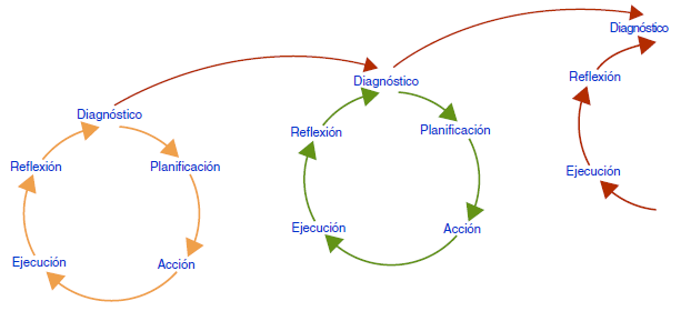 Ahora bien, tras tener claro qué se va a negociar, se inicia un recorrido en la multi-disciplinariedad a fin de determinar cuáles son las principales disciplinas que orbitan la negociación que se va a emprender; a continuación se propicia el diálogo constructivo y la cooperación entre dichas disciplinas. Dejando atrás su aislamiento, se procura enlazarlas progresivamente para formar un todo conexo a fin de ensamblar el andamio que permitirá edificar los medios que acompañarán, fortalecerán y garantizarán la cristalización del método de negociación seleccionado (preferiblemente el método Harvard de negociación). Una vez iniciada la negociación y teniendo presente la metodología de la investigación-acción10 (Ramírez & Llamas Pérez, 2015; Rivadeneira Rodríguez, 2015) como línea de pensamiento sistémico transversal, entramos en una espiral de ciclos sucesivos (fig. 5) (McNiff, 2013) donde la hermenéutica (Nguyen & Swatman, 2001; Susman & Evered, 1978) de un ciclo mejora en forma incremental la hermenéutica del ciclo siguiente, promoviendo un aumento en el nivel epistémico (McKay, Marshall & McDermid, 1994) y permitiendo de esta forma la búsqueda constante de mejores respuestas (Baskerville, 1999).