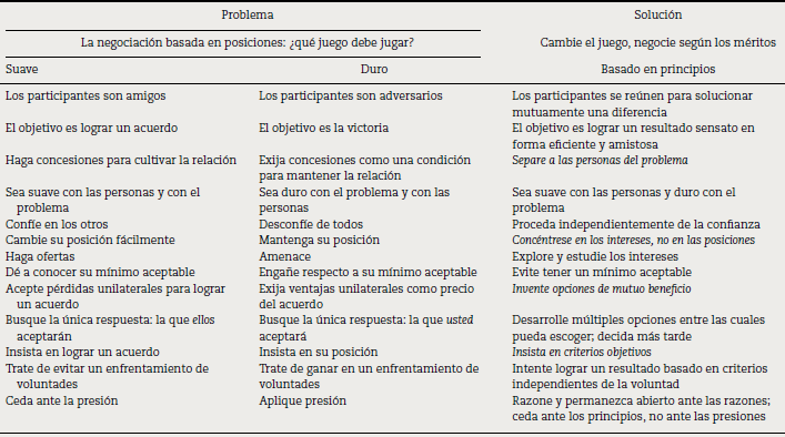 A continuación, un cuadro comparativo (tabla 1) entre los dos tipos de negociadores tradicionales y su longeva manera de negociar (problema) versus la propuesta de Fisher y Ury, donde sustituye problema por solución y negociación basada en posiciones por negociación basada en principios: